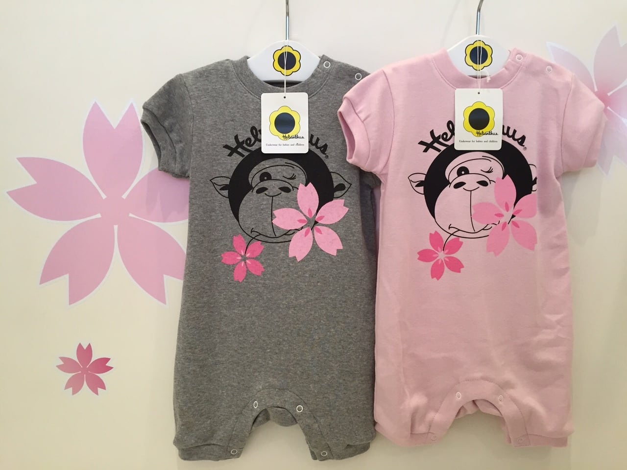 かわいいゴリラ柄と桜のデザインが特徴の赤ちゃん用ジャンプスーツです。